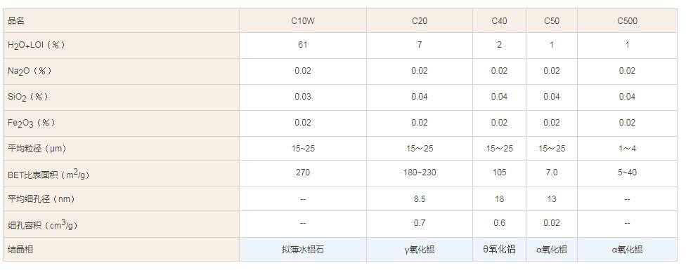 擬薄水鋁石C10W、γ氧化鋁C20及θ氧化鋁C40擁有高比表面積和精密控制的細孔分布結構,所以被用作各種觸媒載體、吸附劑。此外,θ氧化鋁C40及α氧化鋁C50是由擁有較窄的粒度分布的均一粒子所構成,適合作為研磨材料及各種填充物。還備有各等級的粉碎產品。